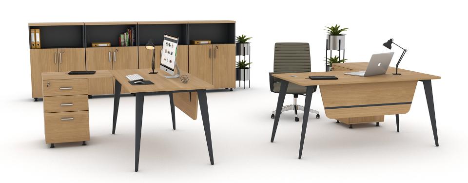 Zengin ürün ailesi ve dinamik yapısı ile yönetici ofislerine canlılık ve samimiyet verir. Tekil Makam Masaları zarif bir duruş gösterirken, depolama ünitesinin entegre edildiği etajerli masalar masif bir algı oluşturur.