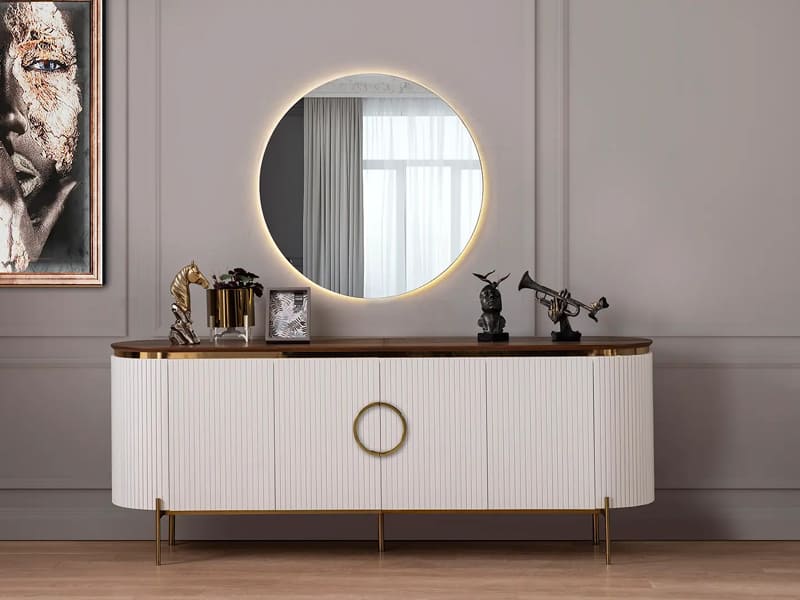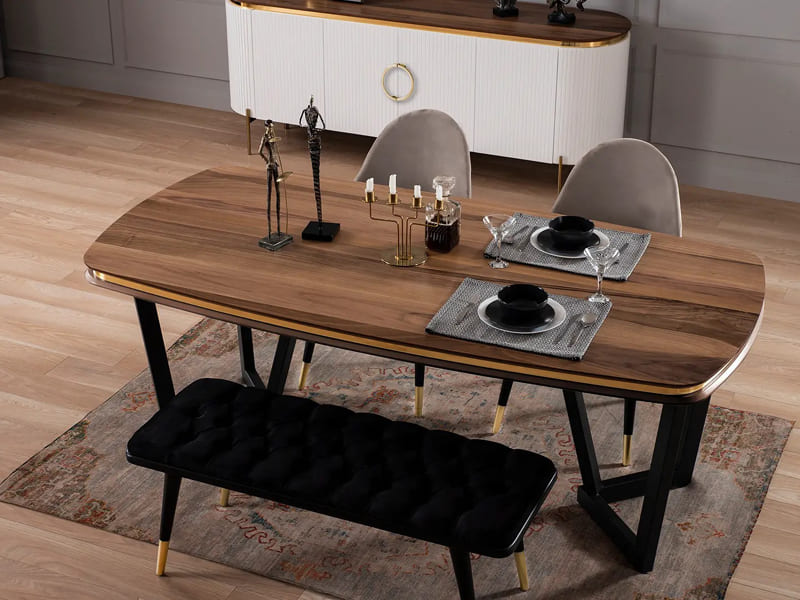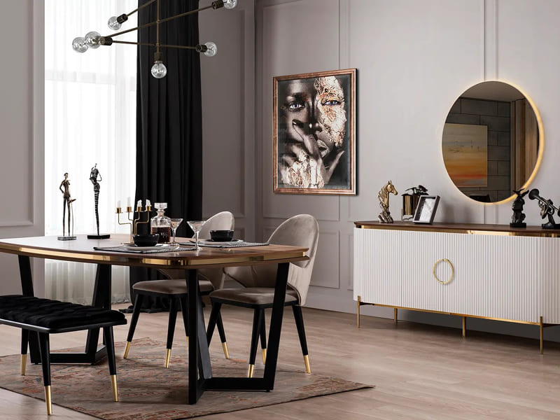 Sürdürülebilir yaşam konseptleri, konforun görsel yansımasına eşlik ediyor. Lüks ve muhteşem bir yemek odası.