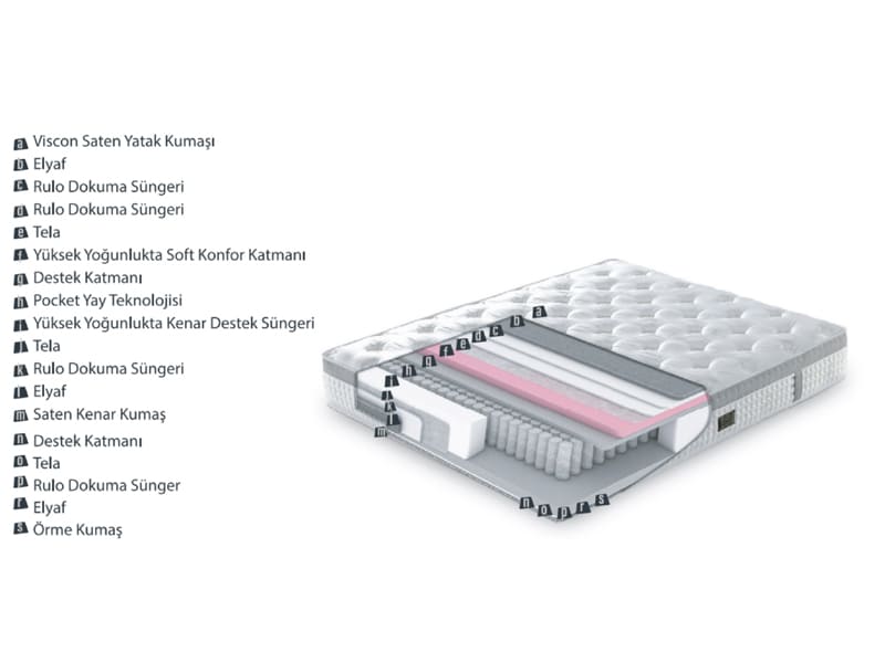 1000 Count Pocket Yay sistemini destekleyen farklı yoğunlukta katmanlar omurganıza ihtiyacı olan desteği sağlar. Özellikle orta sertlikte zeminlerde uyumaktan hoşlanan kişilerin tercihi olan Elvin Yatak, 100% Viskon özelliğe sahip saten kumaşının eşsiz dokusuyla vücudunuzu yumuşak bir şekilde karşılar. Nefes alabilen yapısı sayesinde ısı dengesini ayarlar ve keyifli bir uyku sunar.