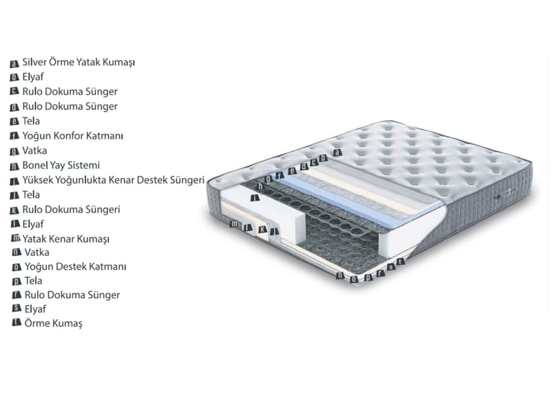 Güçlü yay sistemini destekleyen orta yoğunluktaki destek katmanları ve konfor katmanları hem konforlu uyku sağlarken hem de çift taraflı kullanım özelliği sayesinde yatağınızı belirli aralıklarla çevirmeniz durumunda uzun ömürlü kullanım sağlar ve ilk gün ki formunu kaybetmez