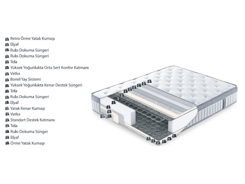 Güçlü yay sistemini destekleyen orta yoğunluktaki destek katmanları ve konfor katmanları hem konforlu uyku sağlarken hem de çift taraflı kullanım özelliği sayesinde yatağınızı belirli aralıklarla çevirmeniz durumunda uzun ömürlü kullanım sağlar ve ilk gün ki formunu kaybetmez.