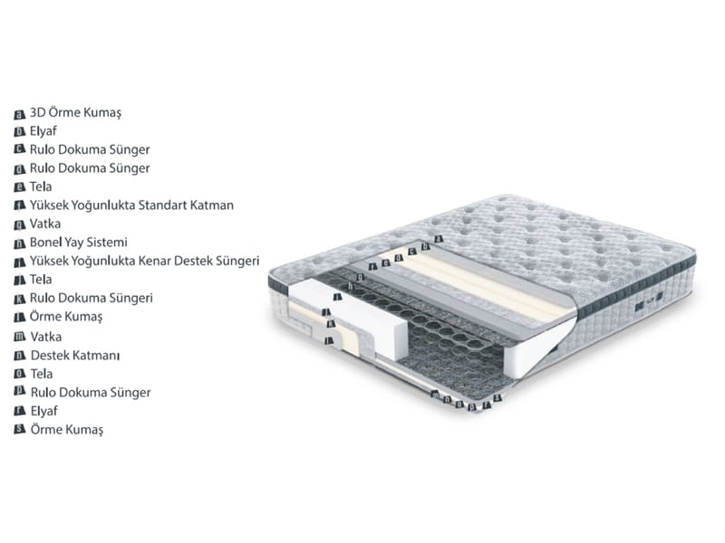 Güçlü yay sistemini destekleyen orta yoğunluktaki destek katmanları ve konfor katmanları hem konforlu uyku sağlarken hem de çift taraflı kullanım özelliği sayesinde yatağınızı belirli aralıklarla çevirmeniz durumunda uzun ömürlü kullanım sağlar ve ilk gün ki formunu kaybetmez