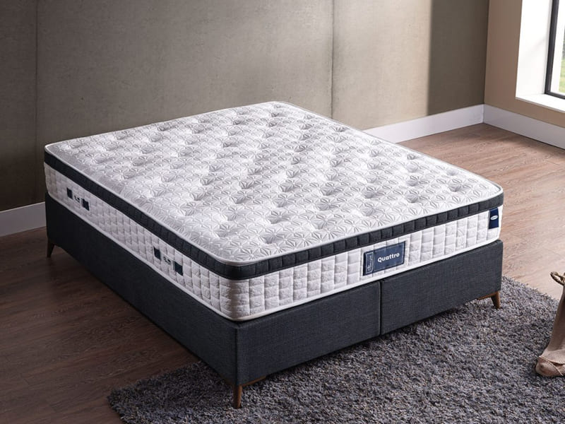 Bonel Yay Sistemi ile üretilen Quatro Yatak, güçlü yay sistemini destekleyen yüksek yoğunlukta katmanlarla birlikte omurganıza gereken desteği sağlayarak rahat bir uyku ortamı yaratır. İçeriğindeki hava geçirgenliği yüksek silikon elyaf vücudunuzu yumuşak bir şekilde karşıladığı gibi hava akışını kolaylaştırarak terlemeyi engellemekte ve uyku konforunuzu artırmaktadır. Yüzeyinde kullanılan yıpranmaya karşı dayanıklı üç boyutlu kumaşı uzun ömürlü kullanım sağlar.