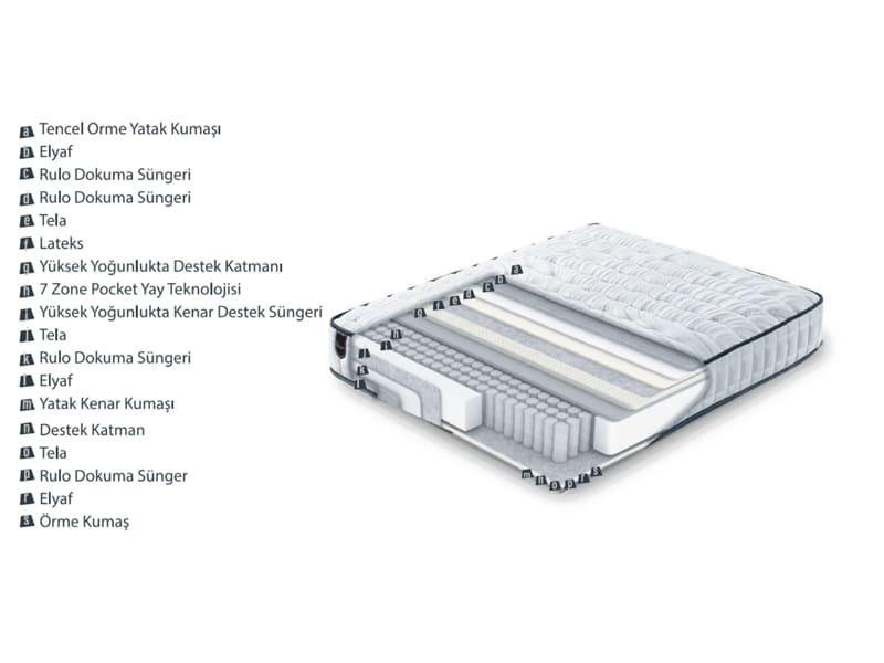 Vücudun yatağa basınç yapan 7 farklı bölgesine özel farklı sertlikte tasarlanmış 7 bölgeli Pocket Yay Sistemi ile uyku süresi boyunca yüksek konfor ve kesintisiz bir uyku ortamı oluşturur.