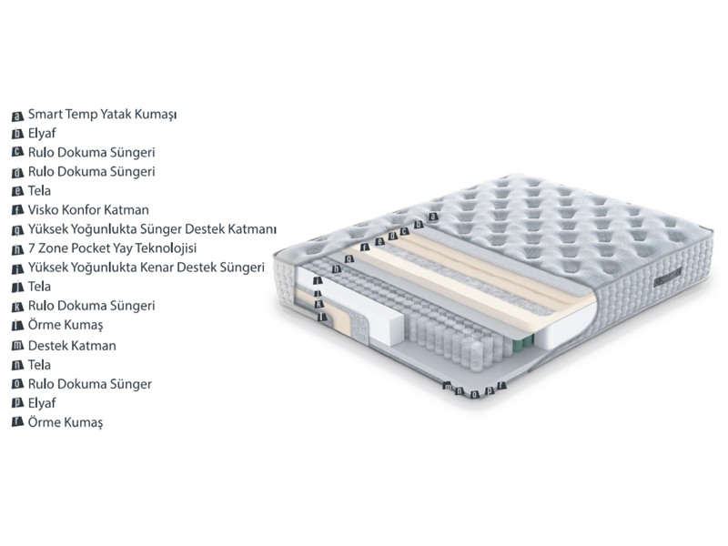 7 ayrı bölgeye konumlandırılmış birbirinden bağımsız yaylar vücudunuzun farklı bölgelerine ihtiyacı olan desteği sağlayarak rahat bir uyku için gerekli uyku pozisyonunu almanıza yardımcı olur. Hafızalı sünger olarak da bilinen Visco katman vücut basıncınıza göre şekil alır ve sizin için gerekli olan optimum desteği sağlayarak konforlu bir uyku deneyimi sunar. Orta yoğunluktaki konfor katmanları vücut basıncınızı dengeler ve uyku esnasında rahat hareket etmenizi kolaylaştırır. Yüzeyinde kullanılan Smart Temp teknolojisiyle üretilen özel kumaşı yükselen vücut sıcaklığına bağlı olarak soğutma fonksiyonunu etkinleştirir ve bu fonksiyon isi dengesi sağlandıktan sonra devre dışı kalır. Böylece sıcak havalarda bile kesintisiz uyku deneyimi sunar ve uyku konforunuzu artırır.